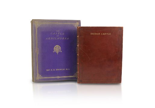 The Castle of Kenilworth, A Hand-Book for Visitors by Rev E H Knowles, published Henry T Cooke and Son, Warwick, 1872, first edition. Original purple cloth with gilt title and decoration, all edges gilt. Photographic frontispiece and vignette to title page, plus 22 mounted albumen photographs and four plans, all present. Corners bumped, some fading to spine, top inch of spine missing, light foxing. Together with Eridge Castle, two bound articles from The Connoisseur and The Badminton Magazine (mounted on pages), full leather binding with gilt titles on cover and spine. Book plate of Idina Brassey, 1865-1951, daughter of The Marquess of Abergavenny who owned Eridge, which was demolished in 1937. (2)