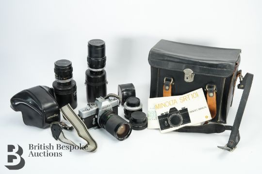 Minolta camera and lens including: Minolta Camera Co SRT101 nr 2443469 with a Vivitar 28-85mm 1:3.5-4.5 Macro Focusing Zoom lens nr 77513734; Minolta 1:28 f=135mm MC Tele Rokkor-PF nr 1587914; Minolta 1:25 f=28mm MC W. Rokkor - SI nr 1564131; Minolta MC Rokkor - PF 1:1.4 f=58mm nr 5850573 together with a SUN Auto Tele-Up Model SR and a Guide to the Minolta SR System and the Minolta SR-T 101 Owner's Manual all housed in a black leather case.