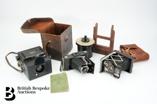 A Victorian W C Hughes magic lantern photographic enlarger with plates, a Newman & Guardia Sibyl camera, Zeiss Ikon Nettar camera, Johnsons developing tank and tray, and Ensign Focal Plane Roll Film Reflex, pat. no. 271145 with case, Watkins Junior Exposure Meter and The Wellcome Photographic Exposure Guide - War Emergency Edition.