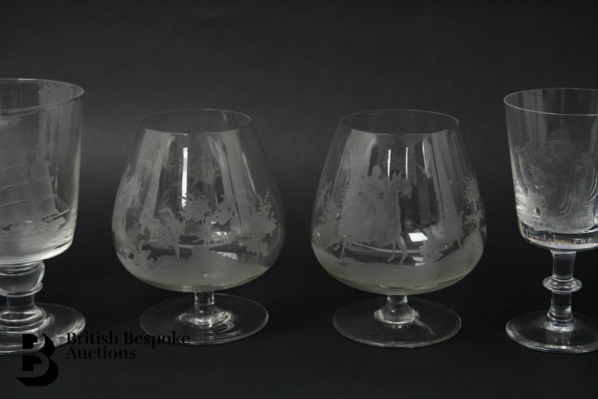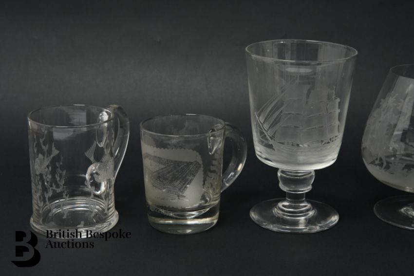 Quantity of glass ware including two large brandy balloons engraved with a horse and rider; Sunderland Bridge rummer 1820 (rough pontil mark); large rummer engraved with a Clipper in full sail approx 16 cms h, 19th century Newcastle tankard engraved with Royal Jubilee Exhibition building 9.5 cms h and another tankard engraved with fish amongst pond weed 10 cms h.