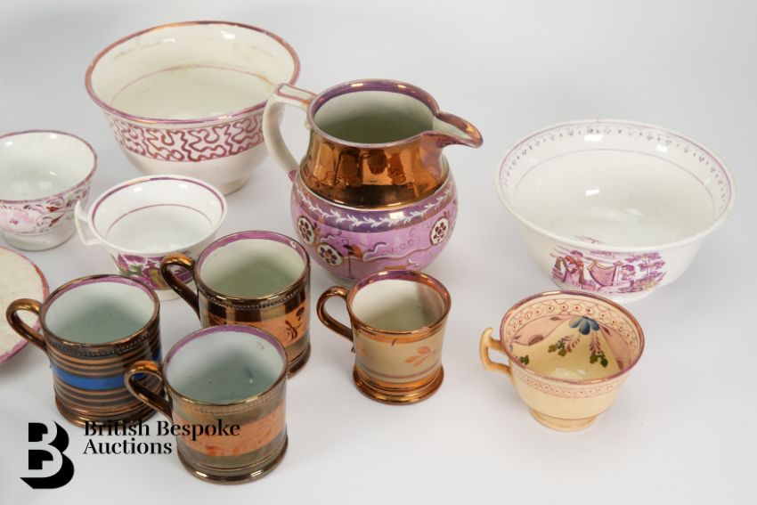 Quantity of 19th century Sunderland lustre cream ware, including two slop bowls (af), milk jug, two coffee cans, two tea cups and saucers, two lustre ware jugs and four beakers.