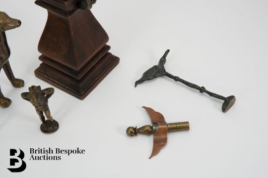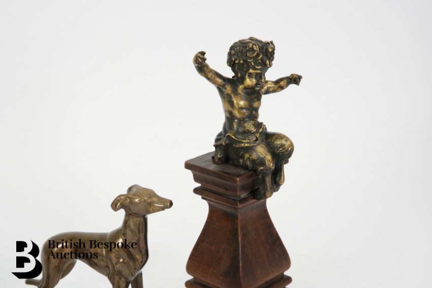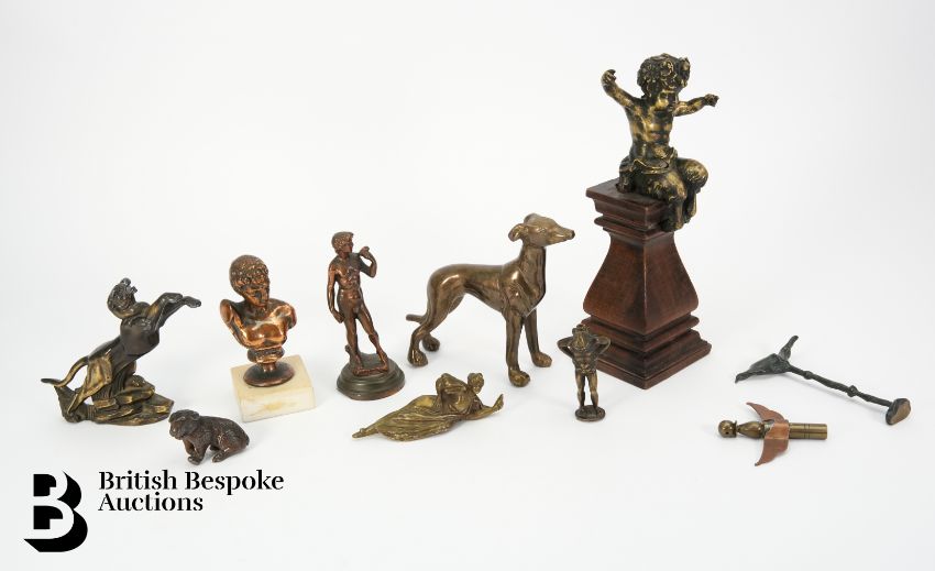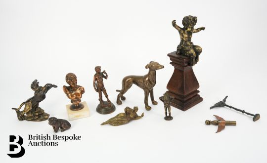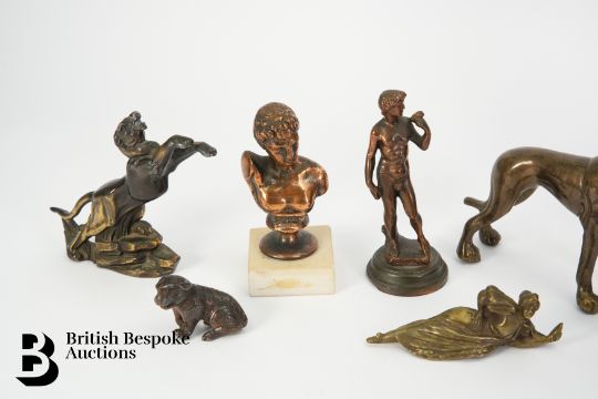 Collection of bronze effect figures, including a faun seated on a plinth, (af) approx 24.5 cms h, leaping panther approx 15 cms in length, grey hound approx 13 h x 16 w cms, classical bust approx 12 cms h together with a six miniature metal figures.