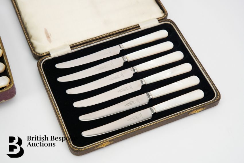 Mother of pearl Gregory Bros fruit knives together with chrome plated fish knives and forks.