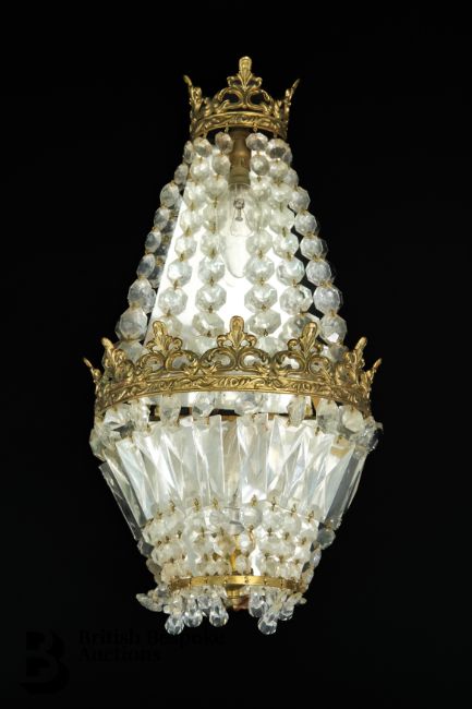 A 20th century glass and brass light fitting, approx 50 cms in length, together with a French brass and crystal drop wall sconce approx 45 cms, and another ceiling light in the French style approx 35 cms h.