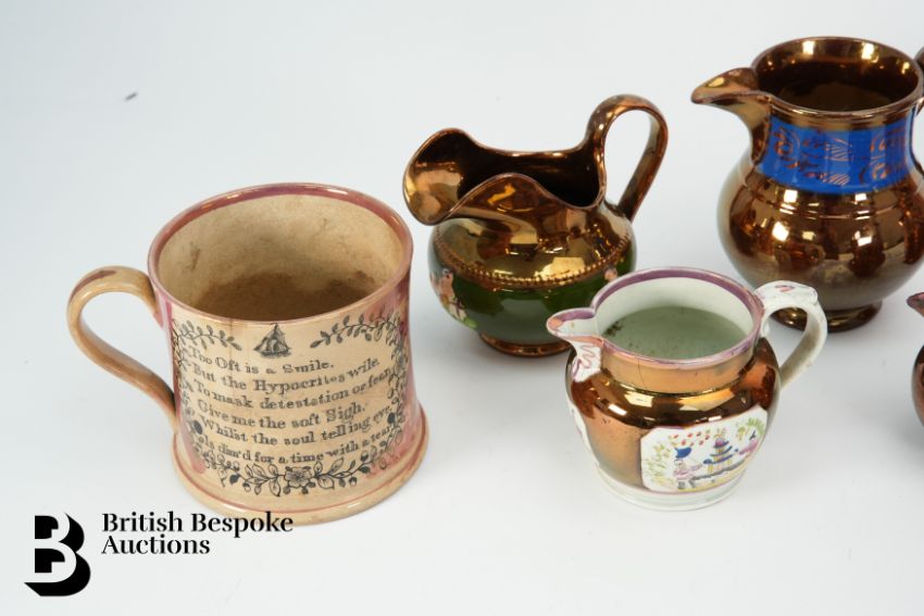 The loving cup has a very fine vertical hairline crack; the second mug has fine vertical hairline crack; three jugs are in good order and the fourth Chinoiserie style jug has two vertical hairline.