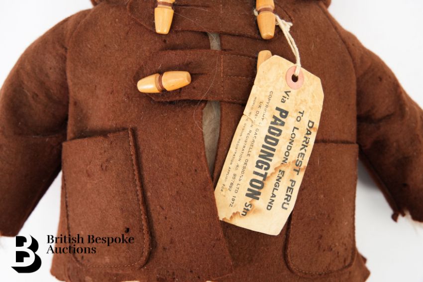 A vintage Paddington Bear, manufactured by Gabrielle Designs, 957892, circa 1972, wearing a brown felt coat, red wellies and an orange hat, label attached to his coat.