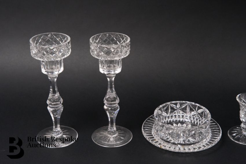 Pair of crystal stemmed candle stands, a circular candle stand for a large pillar candle, another single candle stand and a Dartington crystal candle stand, ideal for Christmas.