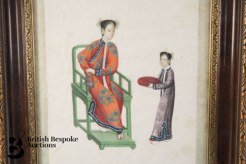Pair of Cantonese rice paintings,  including a noblewoman and attendant, approx 21 x 29 cms and a floral bouquet approx 21 x 29 cms.