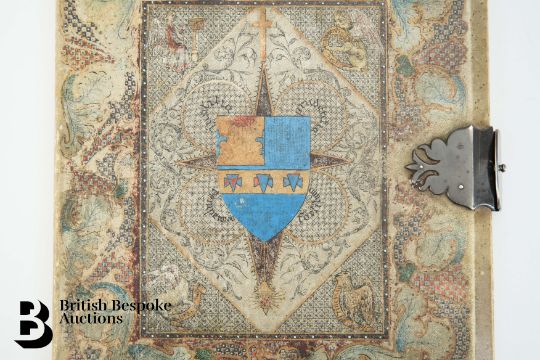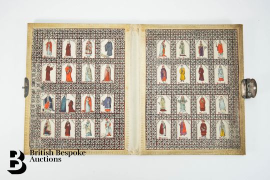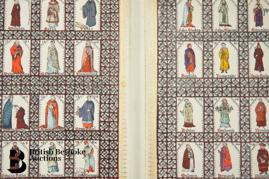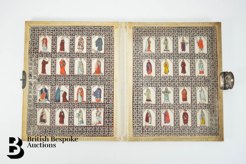 An interesting book cover, relating to the Anglian church, the inside cover illustrated with thirty-eight hand coloured panels, depicting bishops, canons and abbots from the 11th century through to the 16th century, examples include Aldenham, Wilstan, Serlo, Peter, Walter de Lacey, Gilbert Foliot, Nemalines, Carbonel, Henry Blont, John de Feldy, Boteler, Seabrook Malvern, Newton and Parker amongst others, approx 18 x 23 cms.