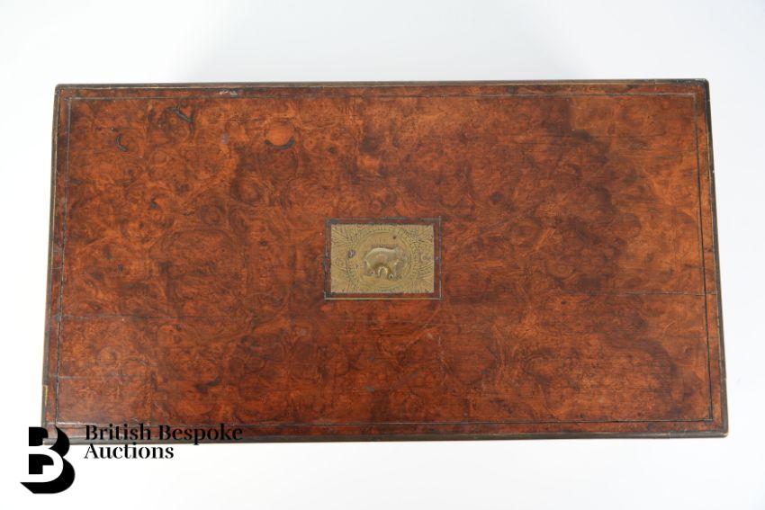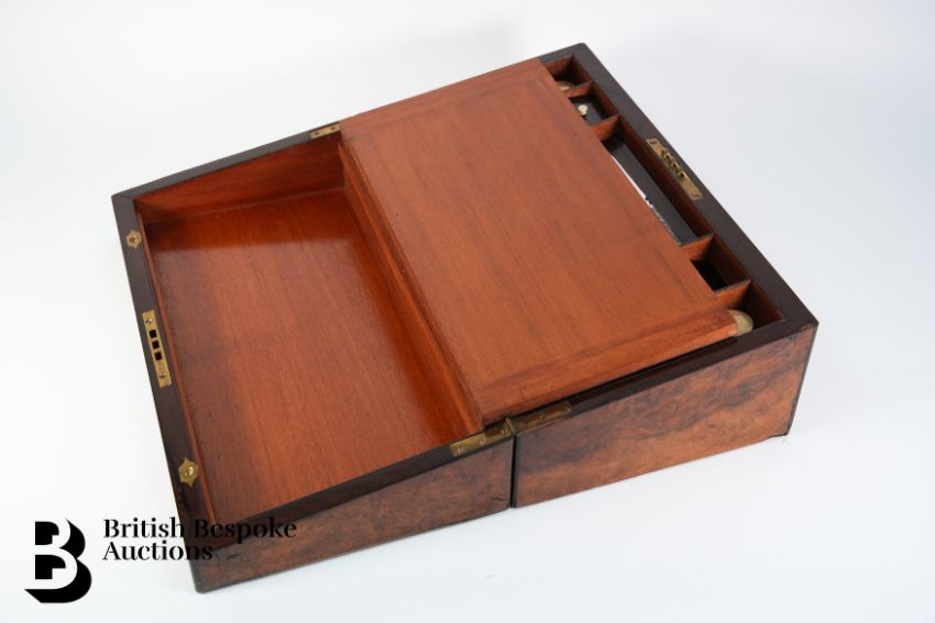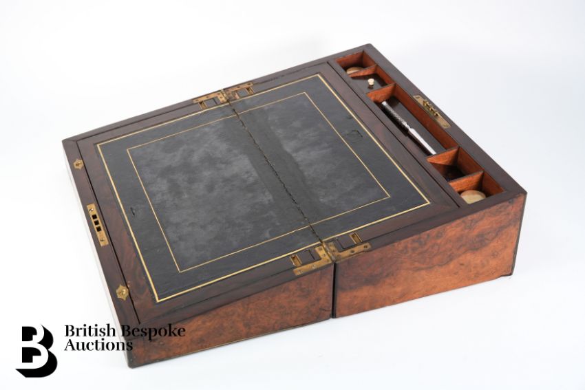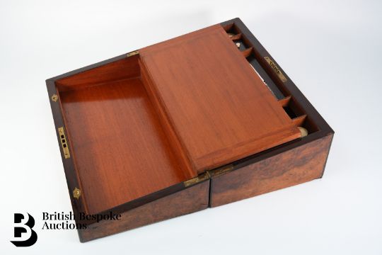 Burr walnut and rosewood veneer writing box, with black leather writing slope, complete with glass ink bottles, two more glass ink bottles and two bottles of brown ink, approx 45.5 x 24.5 x 17.5 cms.
