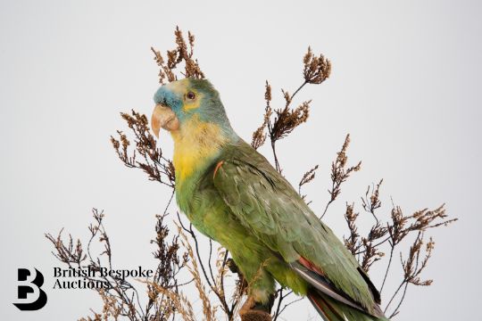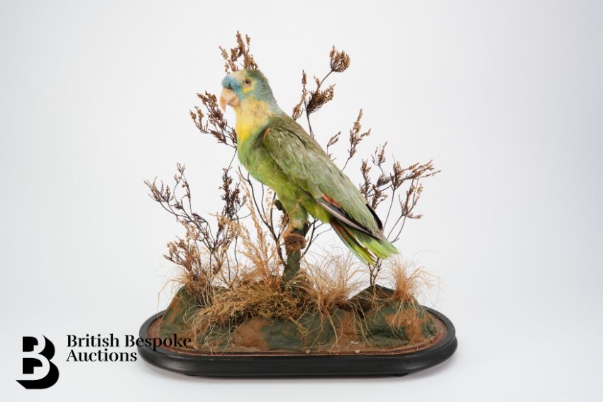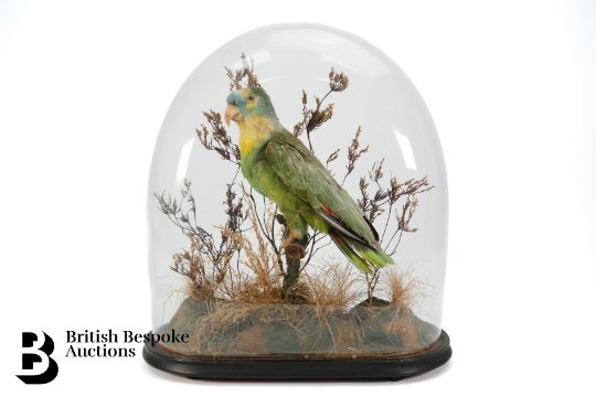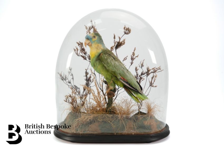 A Victorian taxidermy orange-winged Amazon parrot, in a naturalistic setting, beneath a glass dome, approx 50 cms.