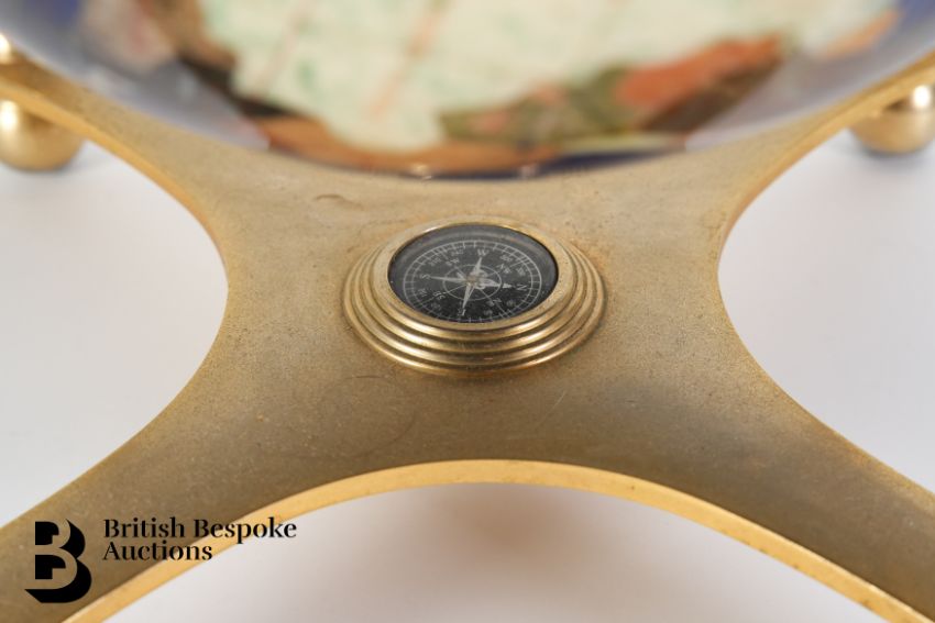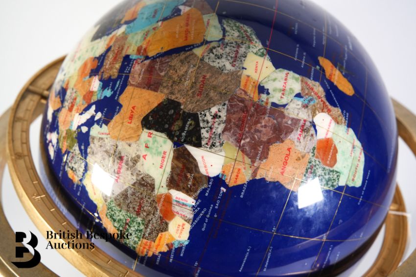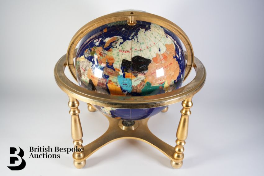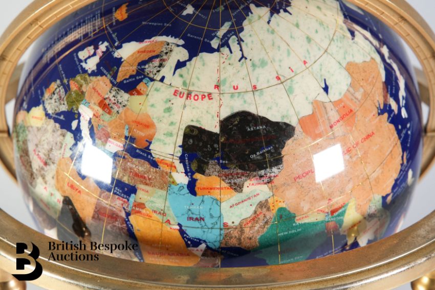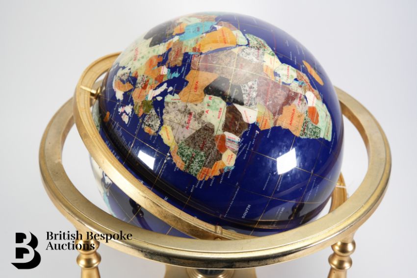 A large blue lapis lazuli table top gemstone world globe, supported on a brass four-footed base with an x-frame stretcher set with a compass. Each continent crafted with semi-precious stones and mother of pearl, approx 50h cms.