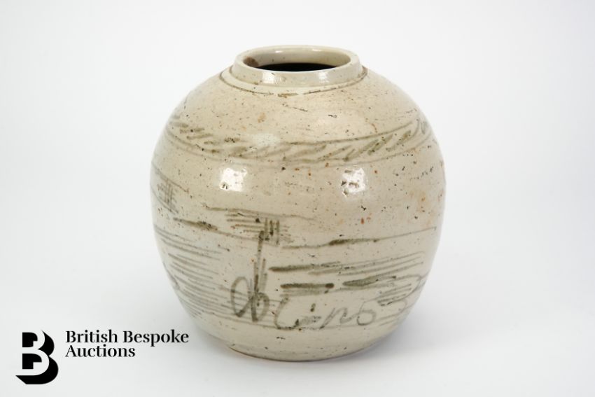 Collection of lustre ware, including a Sunderland loving cup with The West View of the Cast Iron Bridge over the River Wear (af); another lustre ware mug (af); four lustre ware milk jugs of various sizes (af); cream glazed tea pot, approx 15 cms h; James Kent Fleshpots Neptune range blue glazed jug, designed Kate Malone and Steve Dixon, moulded with the Green Man mask and a naturalistic handle, factory marks to base, approx 19 cms h; and Seton Potteries Cornwall, figure of a Tin Miner approx 27 cms h (af); Royal Worcester Old Worcester Parrot porcelain, comprising slop bowl, cake plate, cu and saucer, milk jug (af) together with a Royal Doulton 'Gaffers' tea pot. This lot includes a Sunderland lustre ware tea cup and two saucers. Brown Westwood & Moor (1875-85) white raised tray, with coral motif, approx 14 cms x 9 h cms. Chinese 18th century ginger provincial cream glaze decorated with a brown/grey landscape, approx 17 cms h.