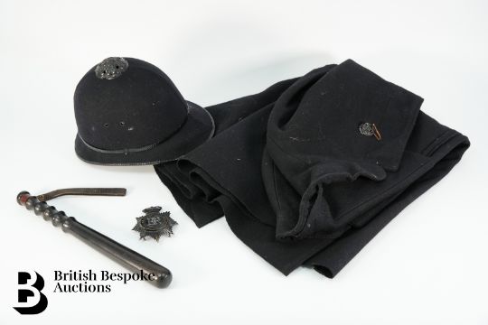 Vintage Boys Brigade military style drum, together with a vintage Gloucestershire Police navy cloak, helmet and truncheon.