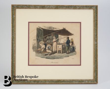 Gaetano Dura hand coloured plates, titled as follows; Gruppo di Marinari, Canta storie detto Rinaldo dated 1834, Maccaronaro, Calesso di Resina, Fruttaiolo in apparato per la festa di Natale, Venditrice di Pollanchelle....dated 1833, Scrivano dated 1833 approx 17 x 22 cms, all framed.