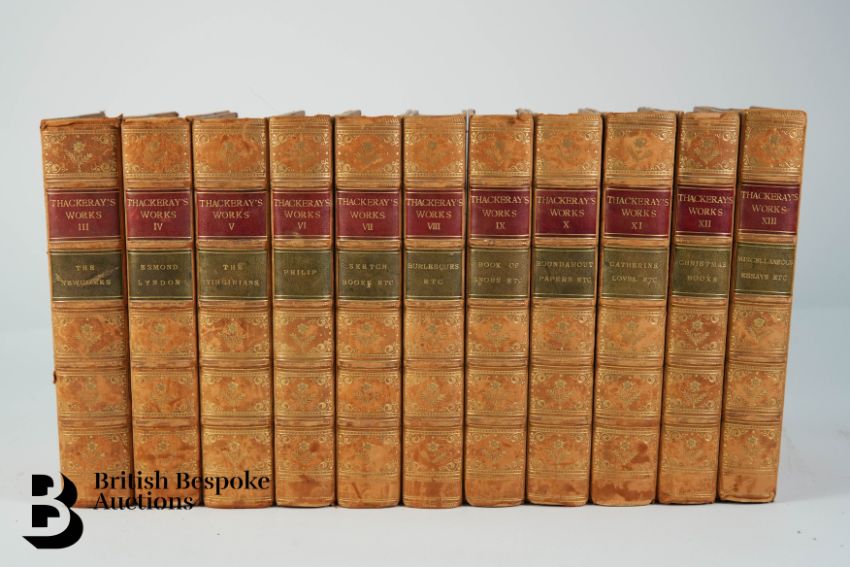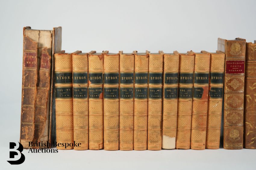 Eleven leather bound Works of Lord Byron, including Vol II and III, IV, V and VI Life, Vol III, IV,V and VI Poems and Vol. VII and VIII Drama', published by John Murray, London 1851, leather bound Thackeray's Works Vol III, IV, V,VI,VII, VIII, IX, X, XI, XII and XIII, published Smith, Elder & Co, Waterloo Place 1896; together with other 19th century books including Shelley's  Poetical Works 'Albion' edition Frederick Warne & Co 1891; Social Life of the Chinese Sampson Low, dated 1868; Victorian Poets by Edmund Clarence Stedman, Anthony Trollope Phineas Redux; Longfellow's Poetical Works publ. William P. Nimmo; Henry Gréville Dosia publ. 1883; Smaller Dictionary of the Bible publ. John Murray 1897 and a copy of Domestic Medicine or a Treatise on the Prevention and Cure of Diseases 1792, by William Buchan M.D (loose binding).
