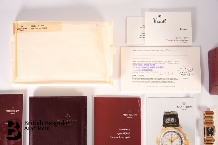 18ct Gold Patek Philippe Twenty-4 rose gold ladies wrist watch, gross 129.01 gms. The watch has a black dial with diamond bezel, with ten diamond hour markers and Roman numerals at noon and six, enclosed by 34 further diamonds, approx. 0.66 pts. Ref nr is 4910/11R-001, calibre E-15 Quartz, six jewel movement, nr 1662298/4122992, diamond set winder, 18ct gold bracelet with folded clasp, sapphire glass and water resistant to 30m. Complete with box, papers, Certificate of Origin, purchased on 20th November 2004 together with a receipt from Pragnell for a full service performed on the 31st August 2023.  Take this opportunity to make this watch your own inter-generational heirloom, as the expression says 'You never actually own a Patek Philippe. You merely look after it for the next generation.' Condition Report The box interior is flaking, currently housed in a Pragnell travelling case.