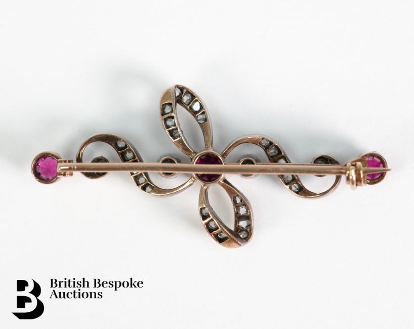 Victorian 14/15ct gold ribbon bar brooch, heightened with one 4mm ruby and two 3.5mm rubies, 16 pts of old-cut diamonds and 19 pts of rose cut diamonds, base metal pin, approx. 45mm in length, approx. 5.43 gms.