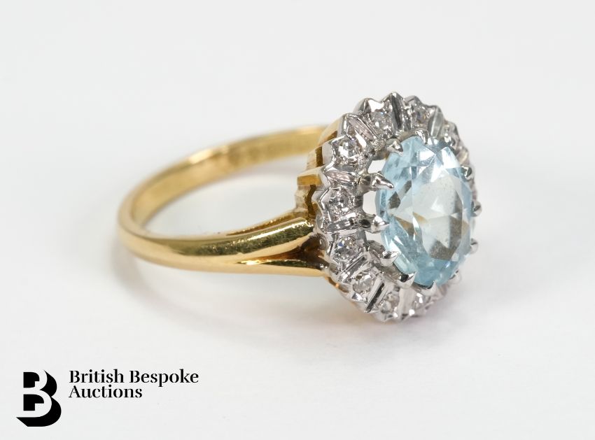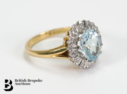 An 18ct aquamarine and diamond ring. The ring set with a 9 x 7mm aquamarine and 12 pts of dias, stamped 18ct, mm CLM, size M, approx. 4.49 gms.