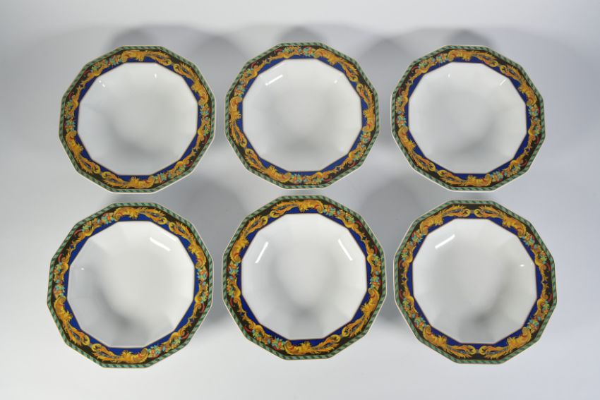 A Versace Le Roi Soleil Rosenthal porcelain 12 place dinner service, comprising twelve dinner plates, twelve chargers, twelve salad plates, twelve side plates, twelve soup bowls, two serving dishes, butter dish and cover, twelve napkin rings, twelve napkins, one gravy boat and one sauce boat with saucers, coffee pot, milk jug, sugar bowl, twelve coffee cans and saucers.