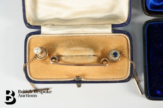 14/15ct diamond and sapphire cluster tie stud, set with a sapphire 3 x 2.5mm and 10 pts of old-cut dias on a 9ct gold safety chain together with a 9ct 4mm pearl tie stud on a 9ct gold safety chain, 9ct stock pin 2.01 gms and three 15ct gold dress studs 2.23 gms.
