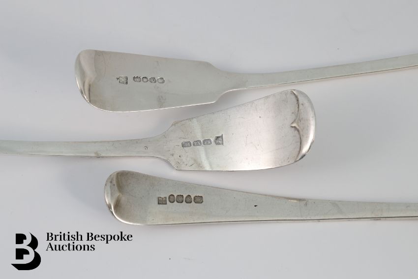 Large silver ladle, London, 1840, mm John & Henry Lias, plus another George III example London, 1776, mm William Eley & William Fearn, 350 gms, 34.5 and 32 cms respectively together with a silver plated example.