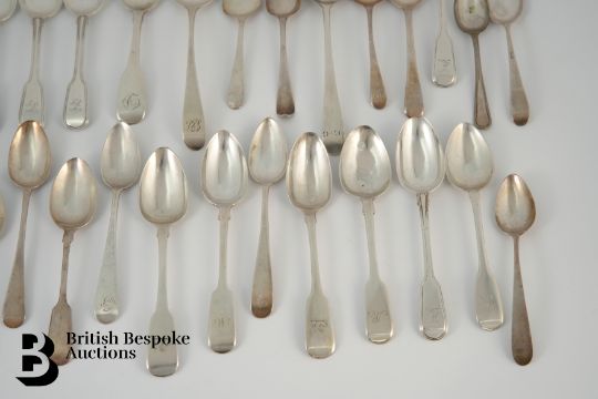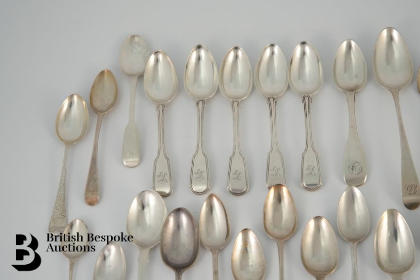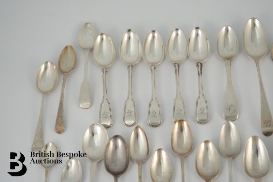 Miscellaneous silver teaspoons, including a set of Georgian five teaspoons, London hallmark dated 1817 mm WEWF, together with another thirty mismatched teaspoons with various hallmarks, total weight 650 gms.