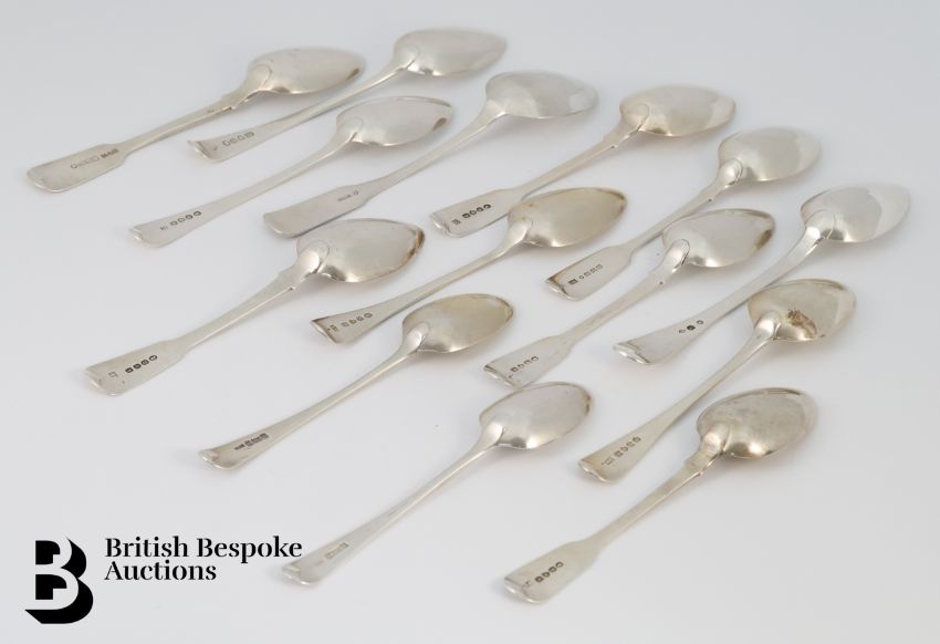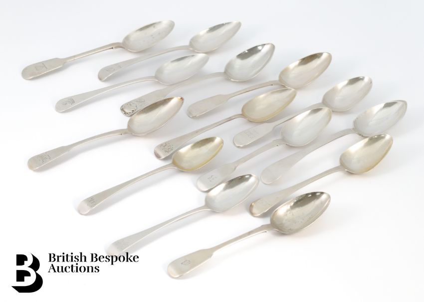Georgian and Victorian dessert spoons, eight London with various date and makers marks; two dessert spoons London dated 1823 mm Randall Chatterton; one spoon Exeter dated 1844 mm Robert Williams; Scottish silver spoons Edinburgh dated 1853, mm JH & S together with two dessert spoons with foreign marks, gross weight 500 gms.