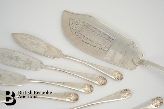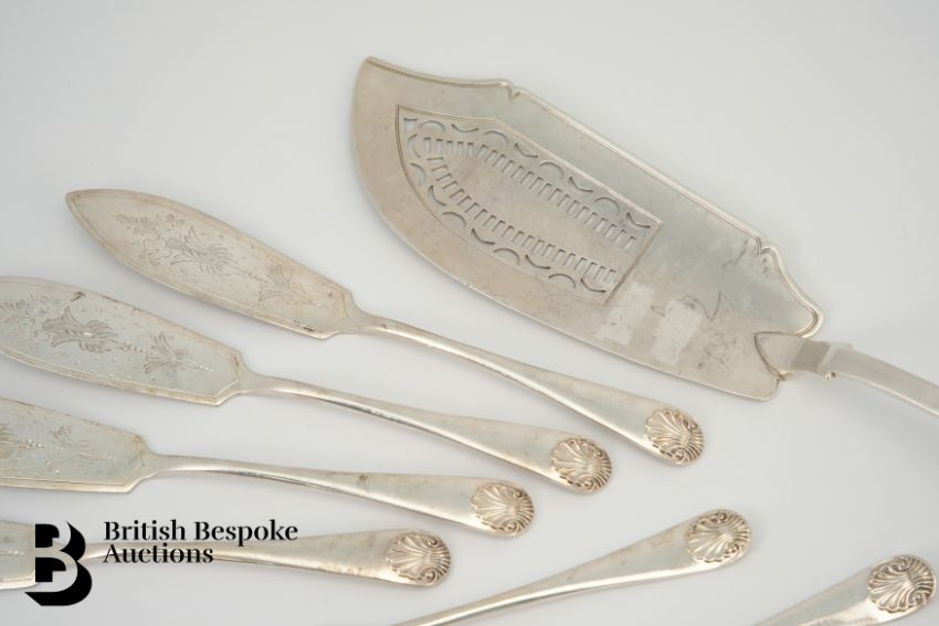 Georgian silver fish slice, London hallmark dated 1806, mm WEWF, approx 141.5 gms together with four Alpha silver plated fish forks and knives.