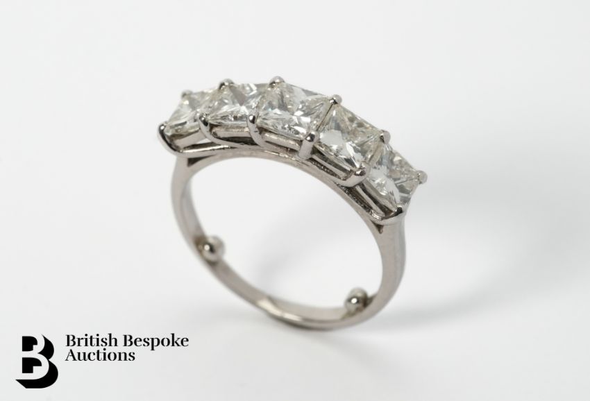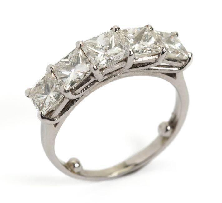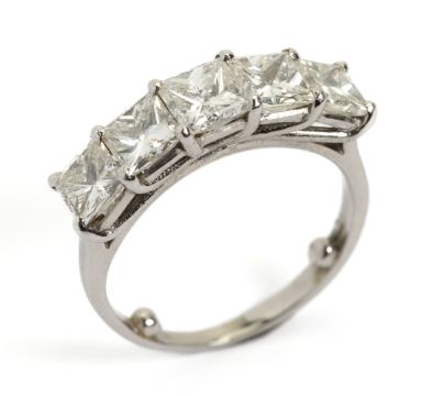 Elegant platinum five-stone diamond ring. The ring composed of five princess-cut diamonds in a stepped setting approx 2.96ct, H colour, VS clarity, size I, (with two bead sizers), 5.35 gms.