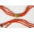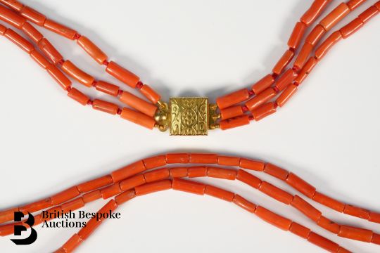 A vintage three strand tubular coral necklace, on a yellow metal clasp, measures 64 cms in length.