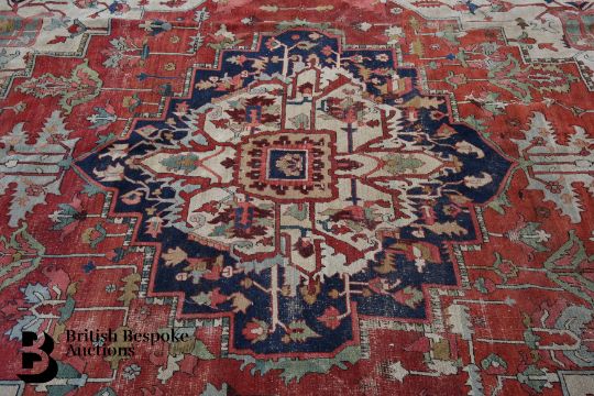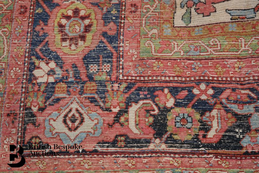 Large 19th century Persian carpet, approx 306 x 400 cms, vivid vegetable dyes of navy blue, salmon pink and green border enclosing a field of flowers with central foliate medallion.