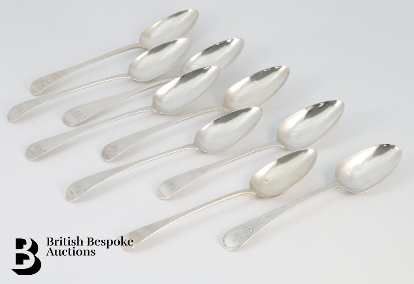 Six Georgian silver tablespoons, three London hallmark dated 1801, mm Samuel Godbehere, Edward Wigan & James Boult together with three more, London hallmark dated 1808, mm William Sumner I. This lot concludes with two Georgian silver tablespoons, London hallmark dated 1791, mm George Smith & William Fearn and a single Georgian tablespoon, with bright-cut decoration, London hallmark dated 1786 mm RC 550 gms, each spoon monogrammed to the terminal