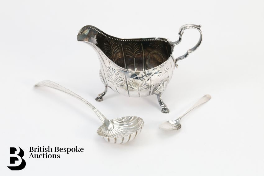 An Irish silver cream jug, supported on hoof feet, Dublin dated 1765, 163 gms together with a with a single coffee spoon, mm SJ and a Irish silver sugar sifter, Dublin hallmark, mm IK circa 1780.