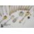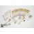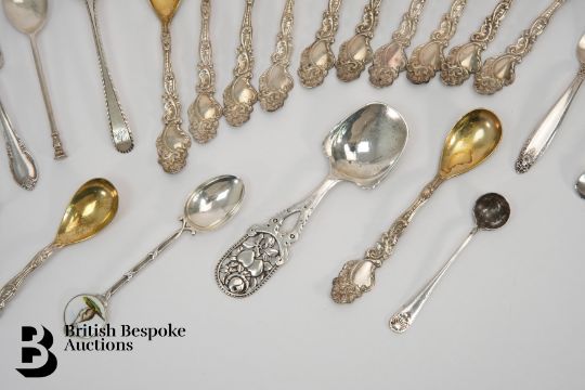 Twelve sterling silver gilt egg spoons, 12.2 cms in length, approx 233.6 gms. This lot concludes with two miniature forks, three silver teaspoons, salt spoon, porridge pusher, silver caddy spoon and another 830 caddy spoon possibly Norwegian approx 147.3 gms.