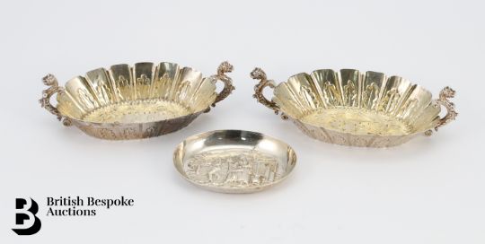 Pair of Continental silver trinket trays, unmarked, approx 14.5 x 7.5 cms, approx 150 gms together with a small Victorian silver pin tray, embossed with a woman spinning wool, London dated 1880, mm John Aldwinckle & James Slater approx 8.5 x 6.5 cms, this lot concludes with a charming Continental silver basket-weave pill box, dated 1832, approx 30 x 40mm, in the form of a woven basket.