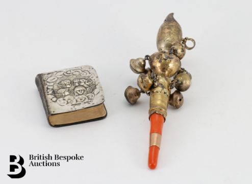 A Victorian silver gilt and coral infant rattle/ teether, with bells, whistle and teether with rose gold collar, approx 17 cms in length together with a miniature book of Common Prayer, 71.4 gms (2)