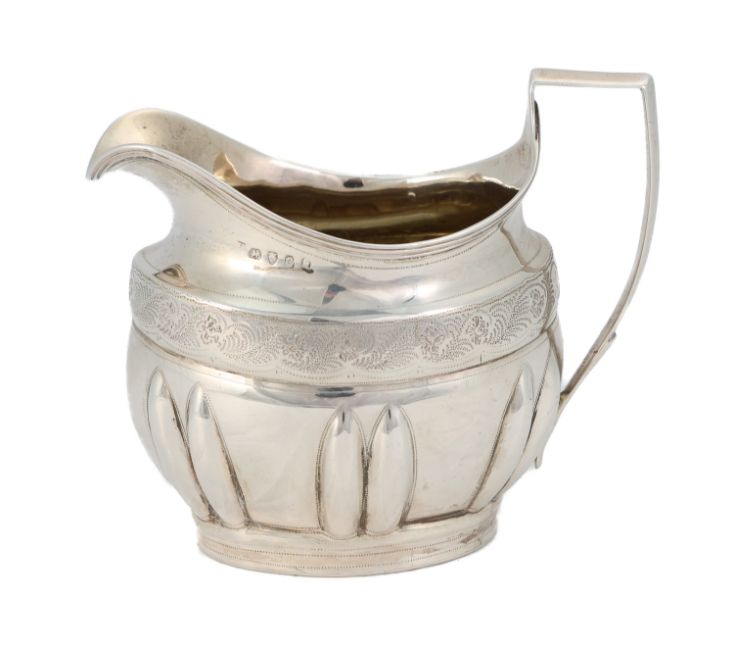 George III five piece silver tea set, comprising tea pot, water pot, tea caddy, cream jug and sugar basin, London assay mark dated 1809, mm Samuel Hennell, approx. 2100 gms/4lbs 6oz. Each piece of elegant lobed design with foliate engraving and fruit wood handle and finials.  Property of a Cheltenham lady.