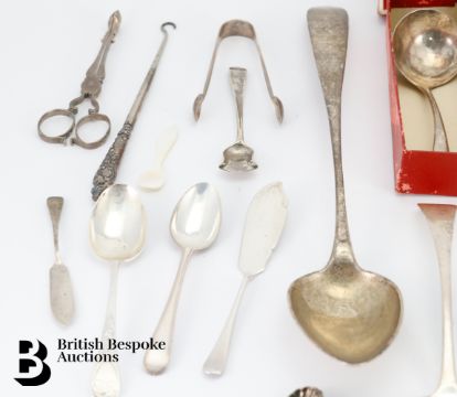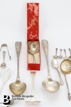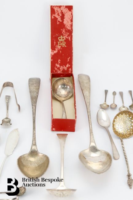 Two large silver ladles approx 33 cms in length; another sauce ladle, Victorian silver sugar sifter, various mustard and salt spoons, various hallmarks.