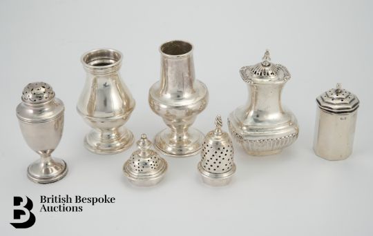 Four silver pepperette with Birmingham, Chester and London hallmarks (rubbed) and a silver sugar caster (marks rubbed), 256.8 gms.