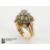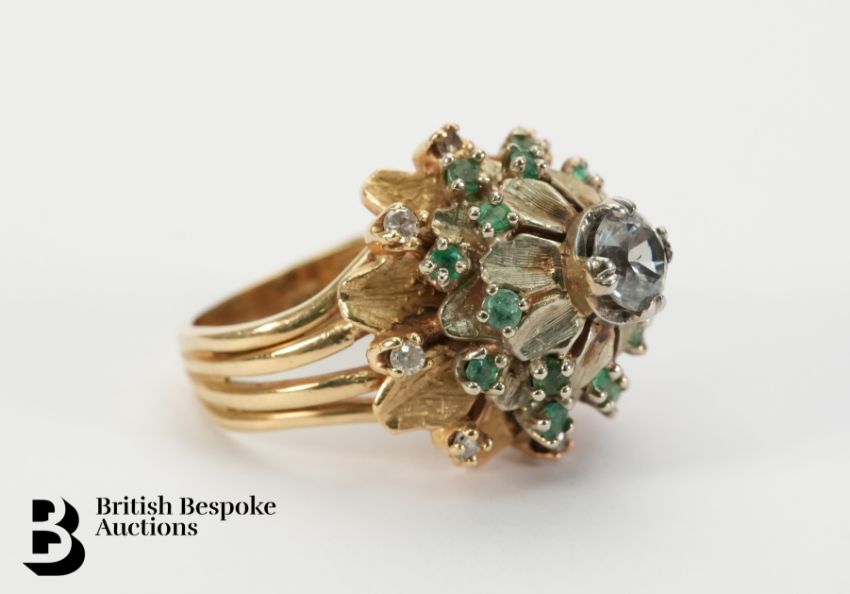 14ct yellow and white gold ring. The bee-hive design set with eight 2.5 pts of 8-cut dias and eighteen 2.5mm emeralds, and a 5.8mm cubic zircon, size L, 12.9 gms.