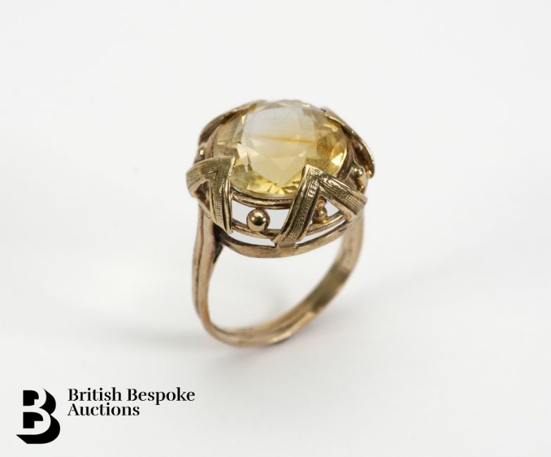 9ct yellow gold quartz ring. The circular quartz measuring 14mm in diameter, in a gold basket setting, size N, 4.3 gms.