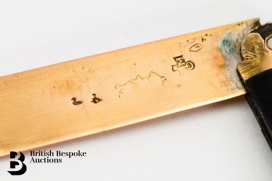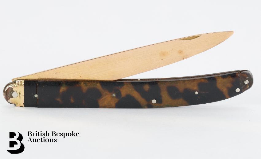 A French gold and tortoiseshell folding fruit knife, late 18th century, with gold blade and tortoiseshell handle, department marks (rubbed), closed 11 cms; open 27 cms long 20.5 cms. (af)