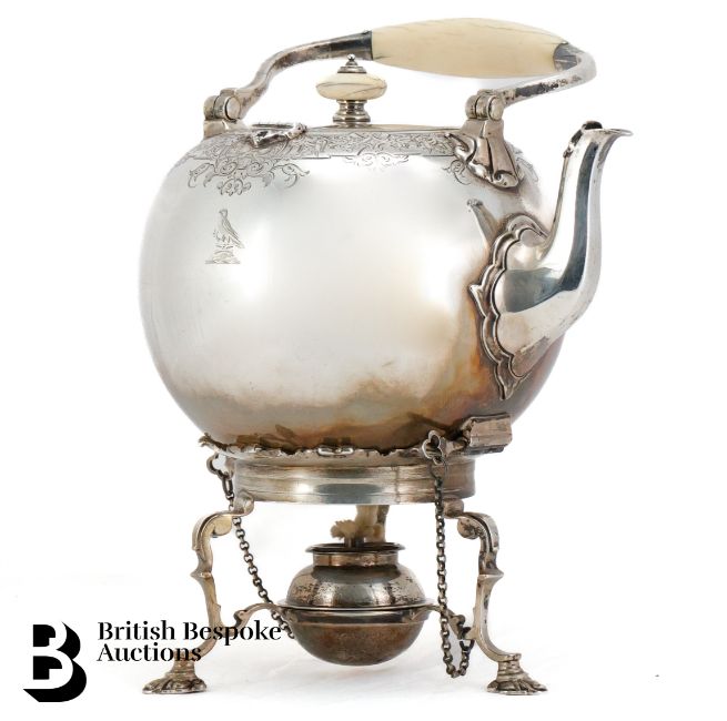 Victorian silver spirit kettle, with ivory hand and finial, London assay dated 1861, mm John Samuel Hunt, 1200 gms, with silver burner and stand approx 622 gms.