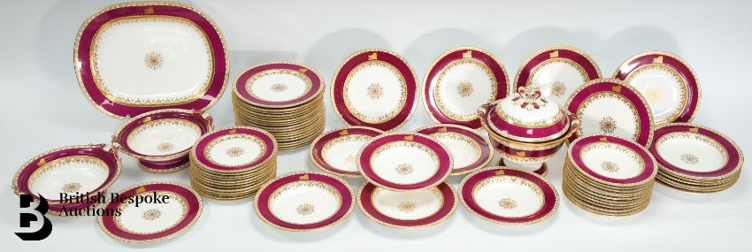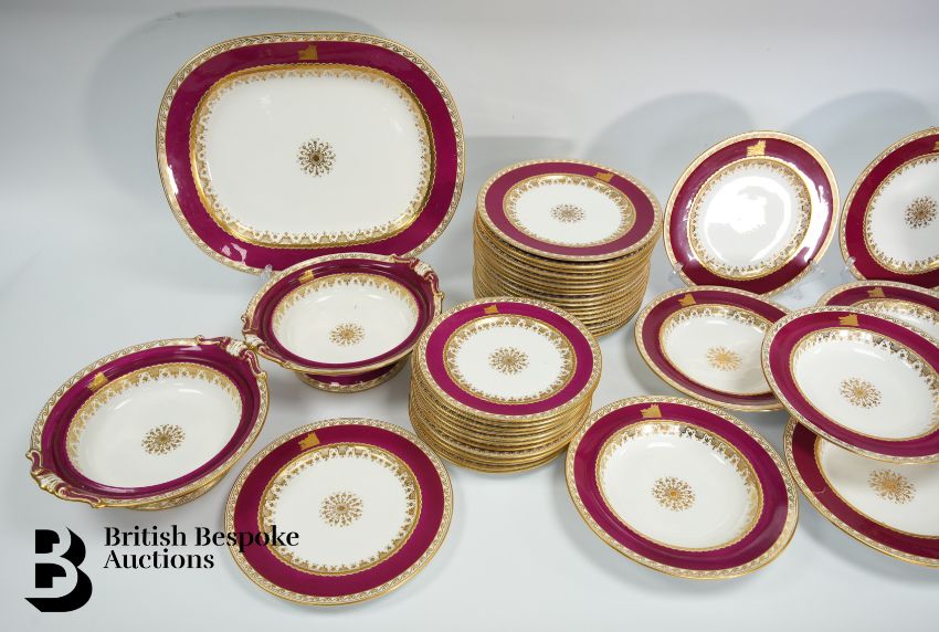 Extensive Copeland dinner service (1867-1890), burgundy and gold nr D704, commissioned, comprising soup tureen and cover, meat plate, two vegetable tureen, twelve soup plates, twelve dessert plates, twenty-four dining plates, twelve luncheon plates, each plate decorated with a gilt boars head crest relating to the Scottish Campbell's, stamped with a green Copeland factory mark.
