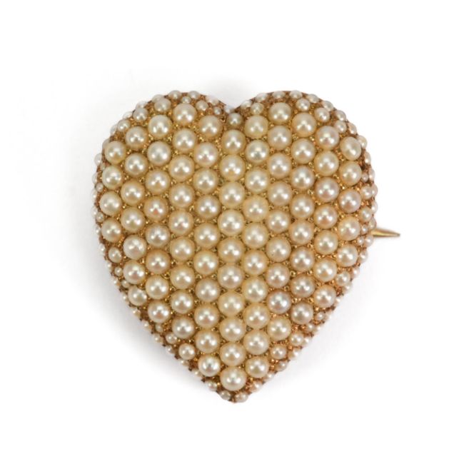 Edwardian 14/15ct yellow gold and pearl brooch in the form of a heart. The heart pave set with 1mm pearls, measuring 28 x 22mm, 7 gms.