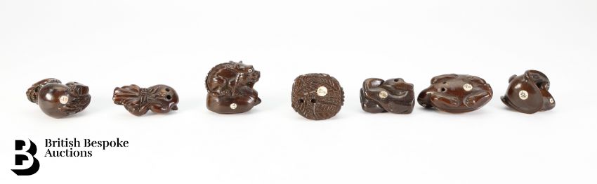 Five early 20th century wood carved netsuke, including an erotic netsuke depicting lovers 45mm; ebony horned oni 53mm; horned oni 60mm; ebony oni 60mm and a boxwood raijin 40mm, each carving featuring a signed bone cartouche. (5)