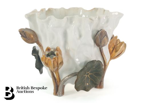 Moore Bros aesthetic movement flower vase, modelled as a lotus flower with applied gilt lotus blossom and leaf, approx 17 h x 19.5 cms, marked Moore.