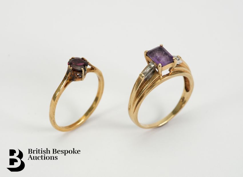 10ct amethyst and diamond ring. The ring set with an amethyst approx 7 x 5mm, flanked by two 5pt baguette cut tapered diamonds, size P, approx 2.8 gms. This lot concludes with an 18ct oval stone (origin unknown) ring, size N, approx 2 gms.