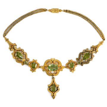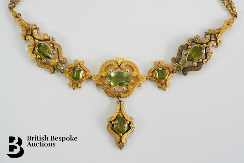 A fine early Victorian 14/15ct gold and peridot necklace. The necklace having a central floral plaque set with a stone (see note) measuring 16 x 10mm in a decorative scroll mount with heart form finial, flanked by two emerald cut peridot 10 x 8mm, with two further emerald-cut peridot 5 x 4mm and two pear-shaped peridot 15 x 7mm and having a removable clip-drop also set with a pear-shaped peridot 12 x 7mm suspended from a double-link chain with engraved clasp, the pendant plaques measuring 190 x 65 cms, total length including clasp approx 38 cms, 35.9 gms, presented in a royal purple presentation box T.R Sachs Jeweller to the Queen, 22 Hyde Park Place.